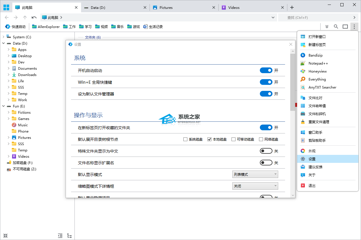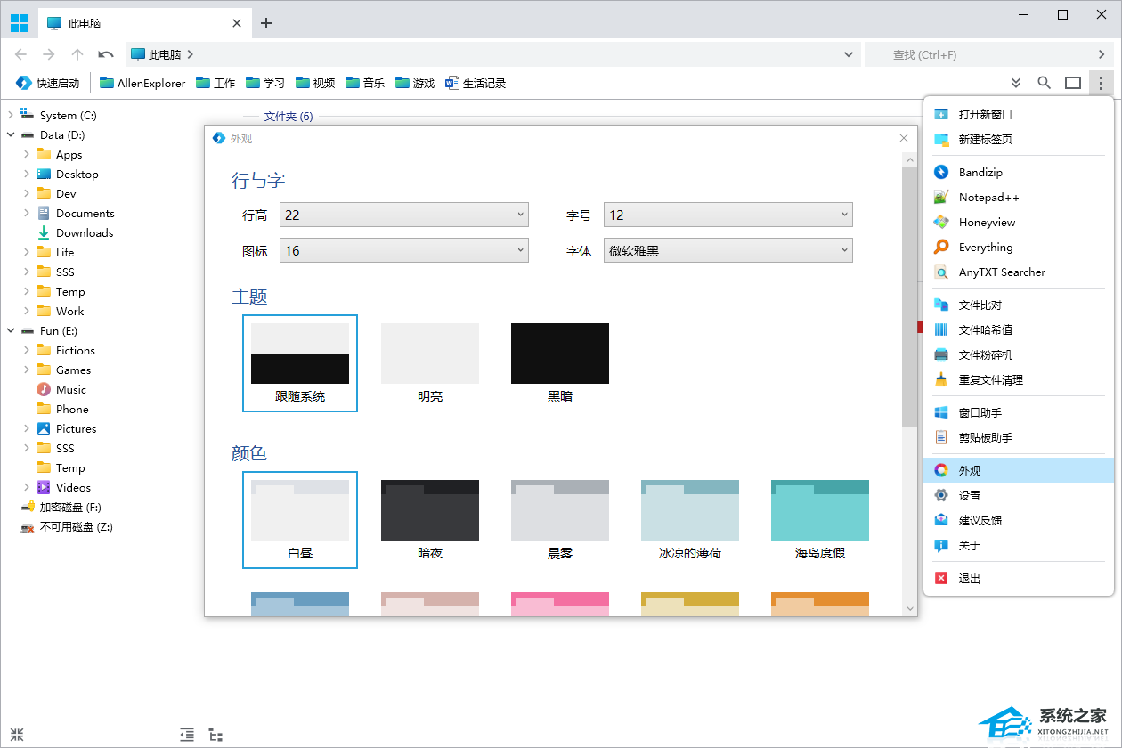 Allen Explorer 采取类 Chrome 界面设计,重构了主要界面图标(Fluent 风格),支持行高、图标大小、字号、字体等界面元素设置,支持多种主题和颜色。