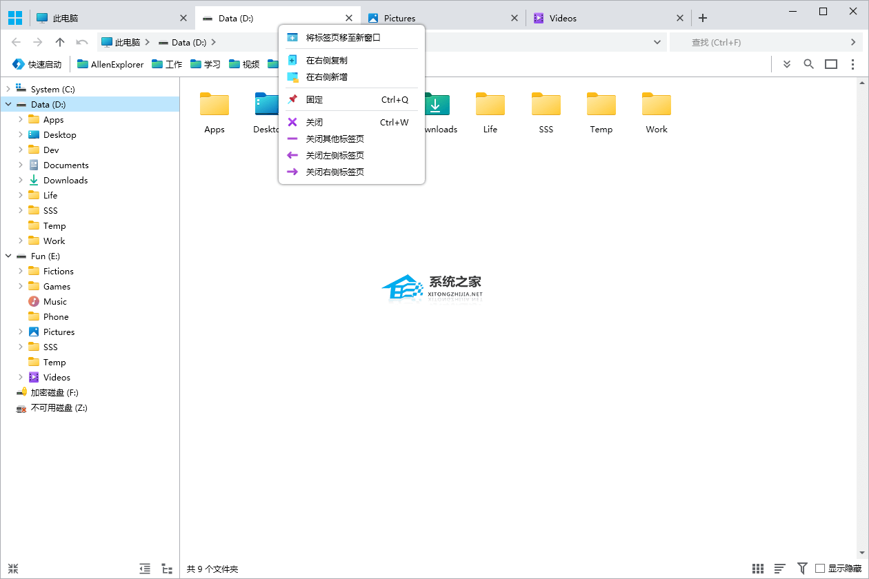 Allen Explorer 拥有顶部标签页,支持对标签页总览、复制、条件关闭等操作;并可直接将文件拖拽到标签页完成移动或复制操作,有效避免了 Windows 任务栏的混乱。