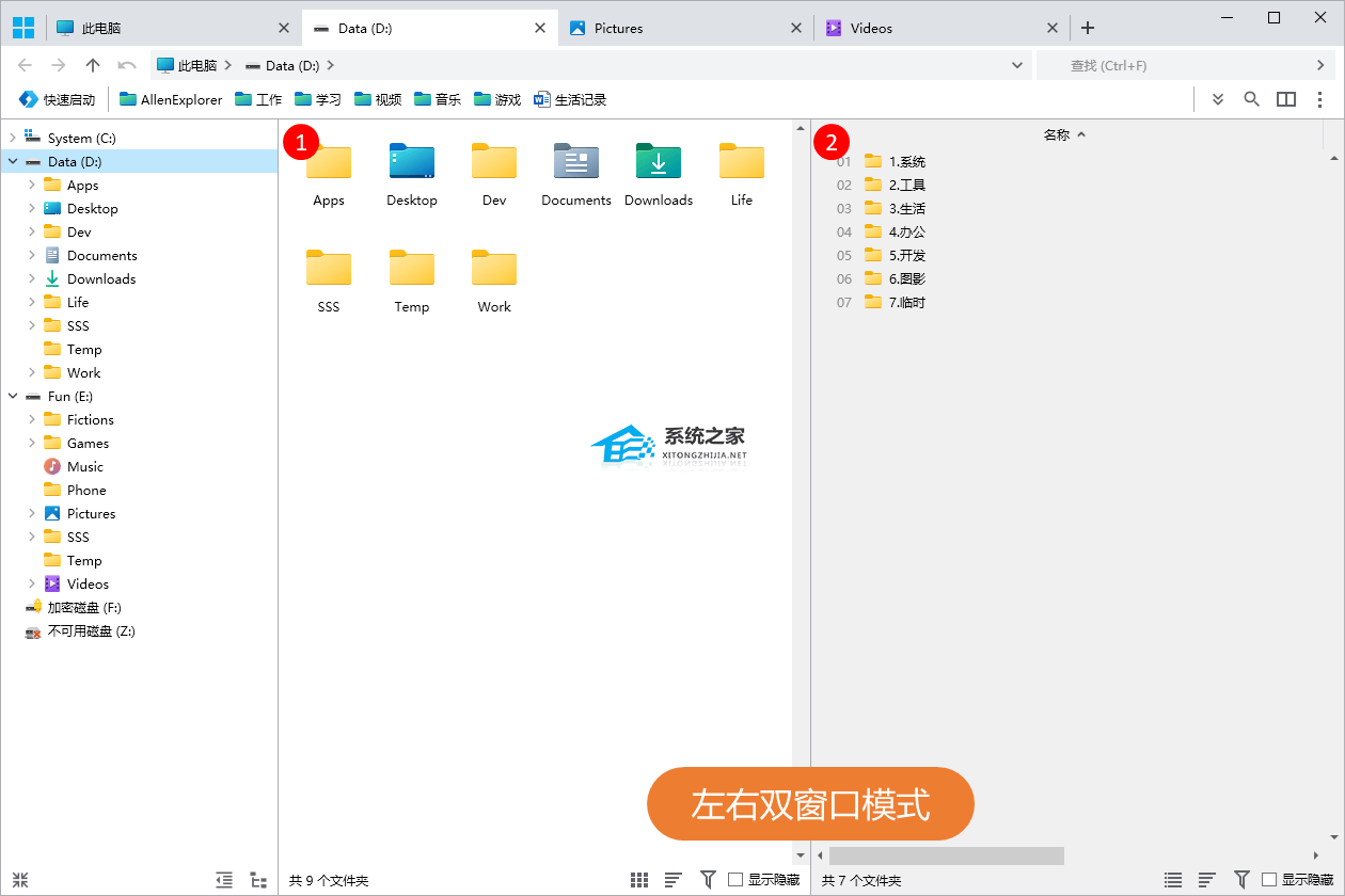 Allen Explorer 支持左右、上下两种双窗口模式,方便文件的比对和整理操作。