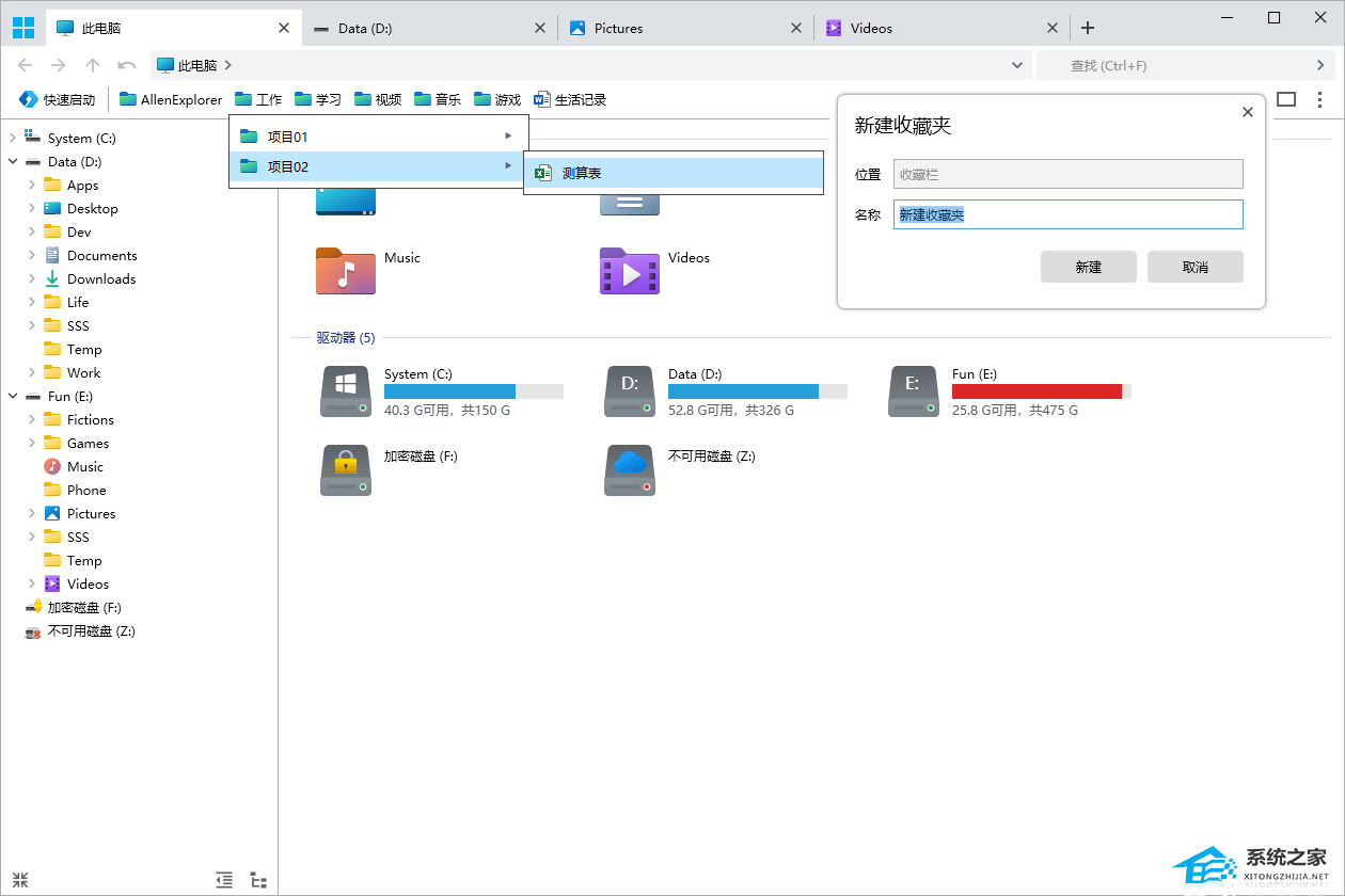 Allen Explorer 拥有强大的收藏功能,可以将文件夹、文件、软件等直接拖拽到收藏栏进行收藏;并支持无限层级收纳,极大简化常用文件打开步骤。