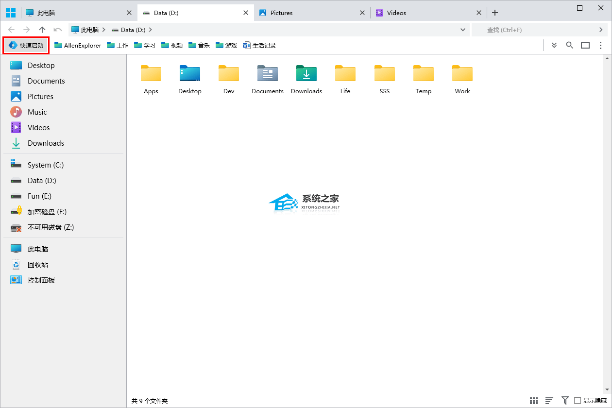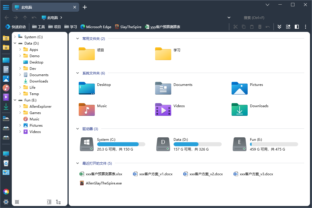 Allen Explorer 拥有快速启动功能,直达 Windows 特殊目录以及磁盘根目录。
