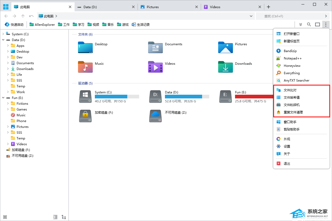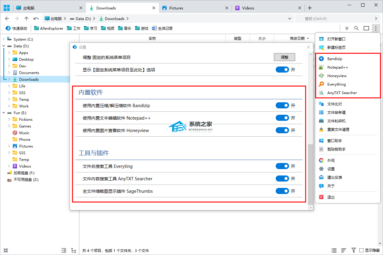 Allen Explorer 无缝集成了【压缩/解压软件 Bandizip】、【文本编辑软件 Notepad++】、【图片查看软件 Honeyview】、【文件名搜索软件 Everything】及【文件内容搜索软件 AnyTXT Searcher】,用户体验全面超越 Windows 自带软件或国产同类型软件。可以选择不启用,而使用自行安装的同类型软件。