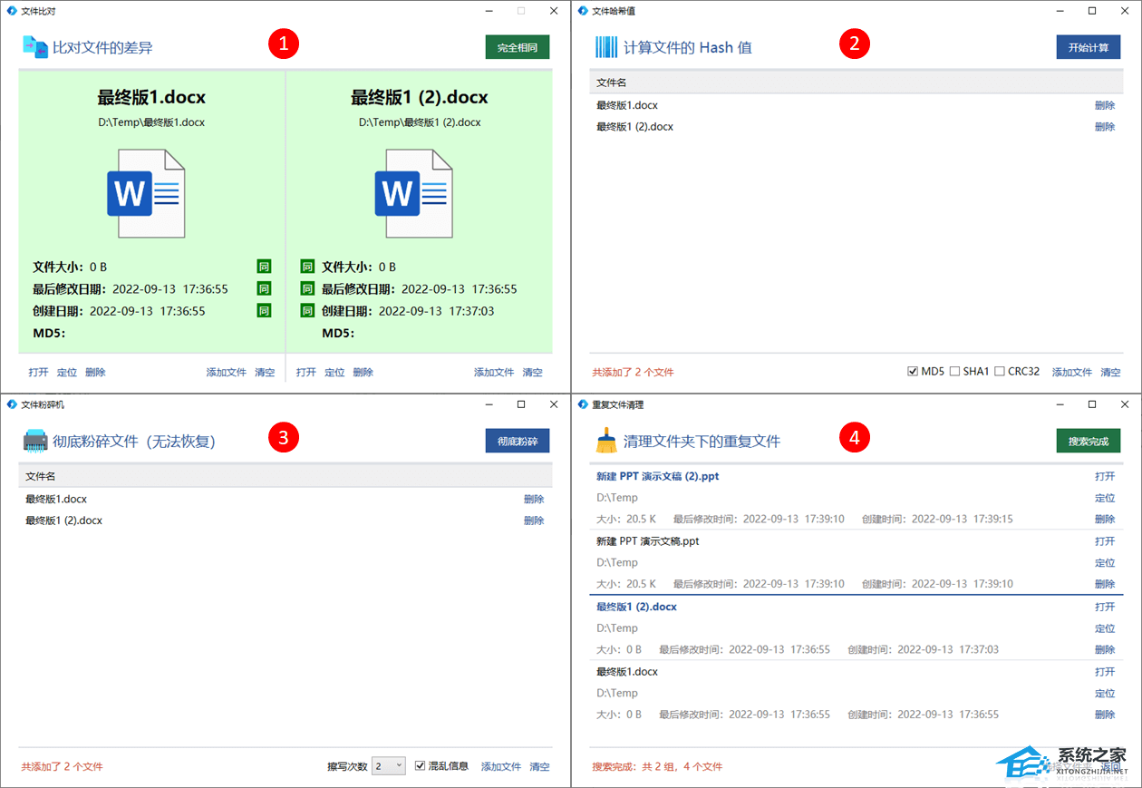 Allen Explorer 原生支持【比对文件差异】、【计算文件 Hash 值】、【粉碎文件】、【清理重复文件】及【清理空文件夹】等附加功能。