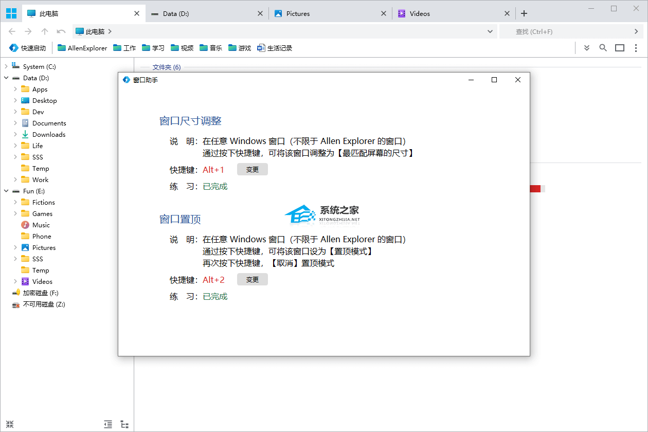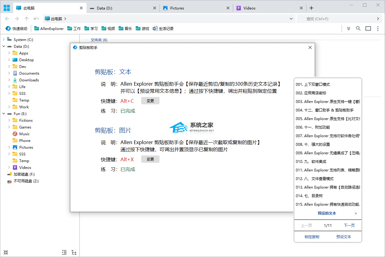 Allen Explorer 原生支持一键【窗口尺寸调整】与【窗口置顶】功能,并极大的强化了 Windows 原生的【文本剪贴板】与【图片粘贴板】功能。