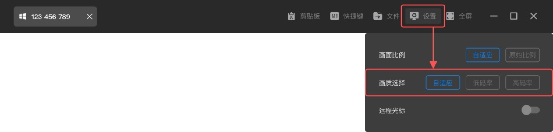 进入远控界面后,找到画面「设置」按钮,在设置下拉层即可看到画质选择项,如图所示: