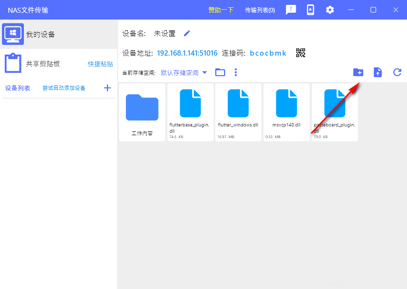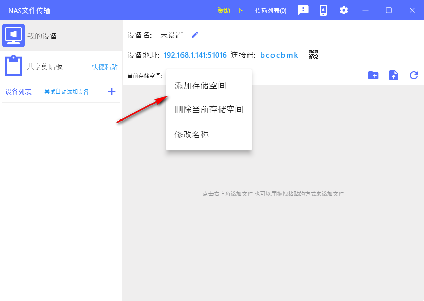 4. 添加储存空间,可以在软件创建新的储存空间,支持上传文件到储存空间共享。