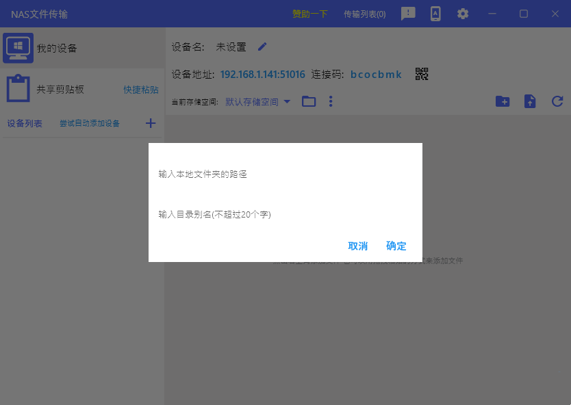 5. 这里是文件夹添加的界面,输入本地文件夹的路径,输入目录别名(不超过20个字)。