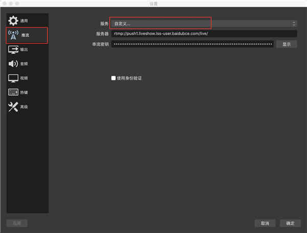 4. 在弹出窗口中依次点击左侧【推流】,右侧『服务』选择「自定义」。