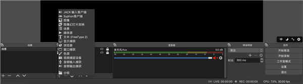 7. 在OBS主界面,默认下方有场景和来源模块,您可以根据实际直播内容选择添加不同的素材以实现直播间的多样化配置和场景切换。