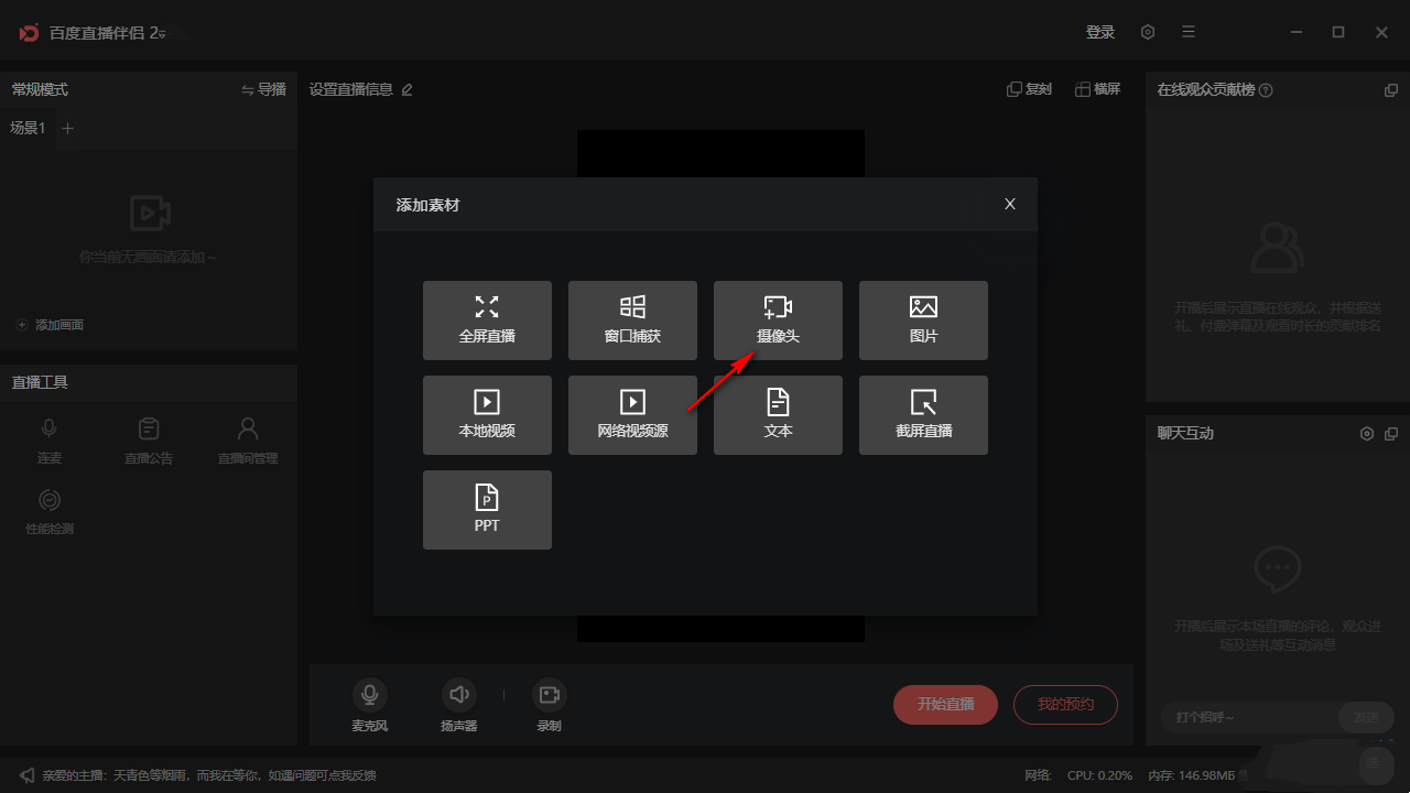 2. 添加直播内容,可以在软件左侧添加常用,可以将摄像头画面添加到软件。