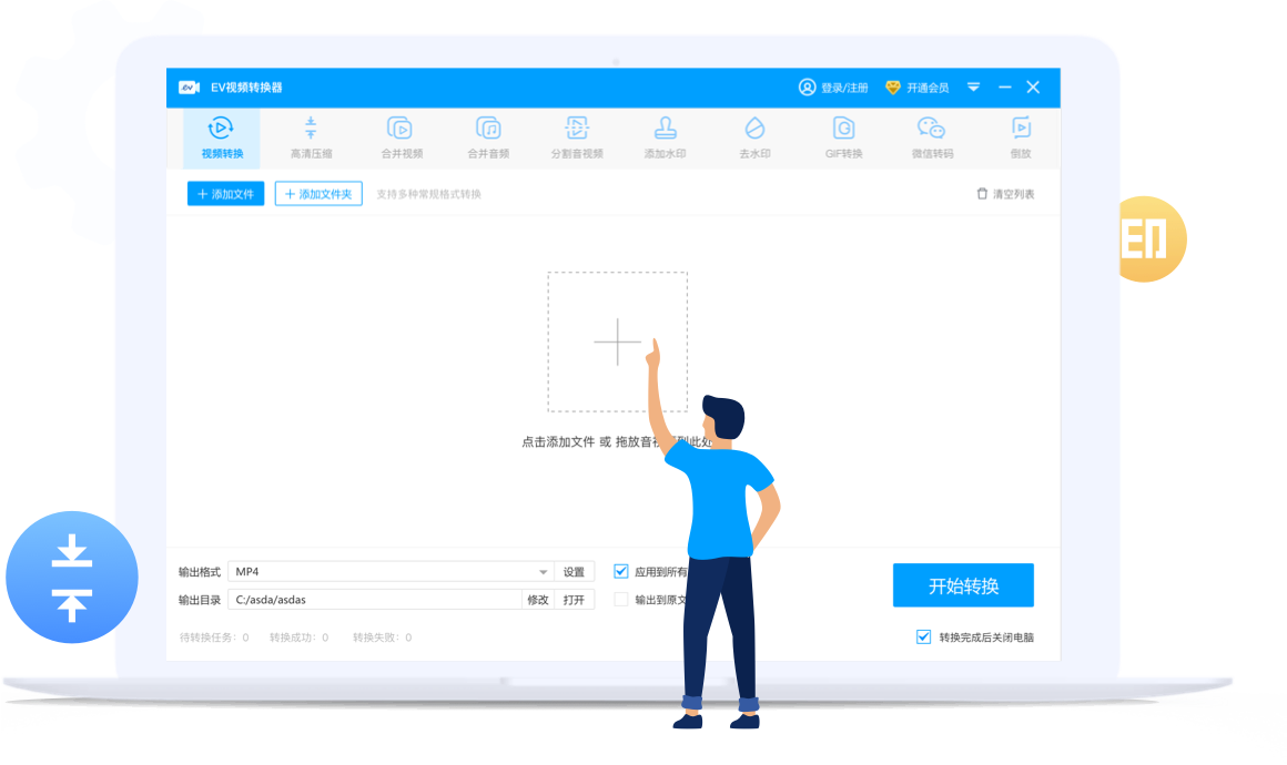 EV视频转换器是一款简单好用的视频转换软件,支持音视频格式转换、高清压缩视频体积、无损合并、分割视频、批量添加水印等多项功能。EV视频转换器软件界面设计简单明了,操作轻松易上手,用户只需一键点击就能轻松完成视频的转换任务。