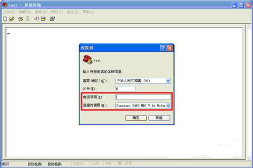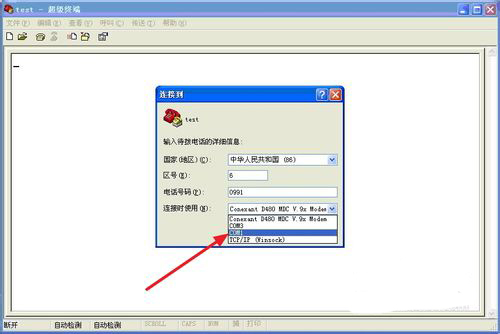 在“电话号码”中输入任意的数字即可,而在“连接时使用”中则需要选用相应的com口,在此我们选择com1口,如下图所示。