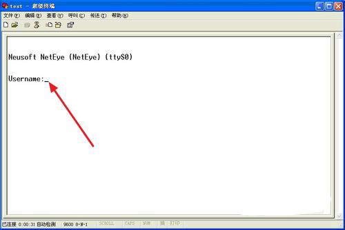 进入命令行操作视窗后,鼠标单击本视窗内的任意空白处,确保光标处于本视窗内,之后连续敲击,就可对连接的网络设备进行配置和操作,下图红色箭头所指的位置,是输入网络设备用户名的地方。
