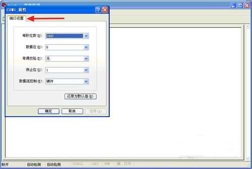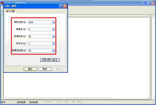 在“com1属性”视窗中,我们只需单击“还原为默认值”按钮,即可使其中各项参数自动恢复为符合本此连接属性的数值,也可手动进行设置,参数如下图红框中所示。