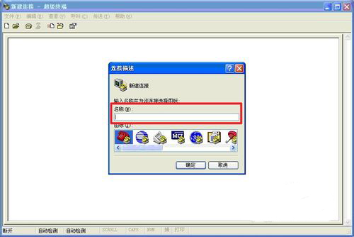 单击进入“超级终端”后如下图所示,红框中所示是要给超级终端命名的地方。