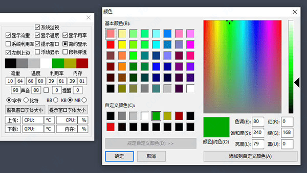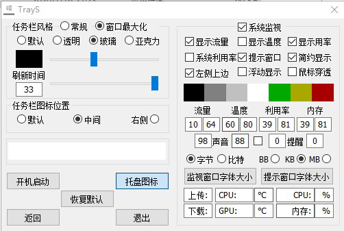 TrayS这款工具只有20几KB大小,可以说是小到极致,解压完成无需安装,直接双击运行程序,即可在任务栏显示流量、温度等信息,将鼠标移至任务栏还可显示更多内容。右键显示位置可打开设置菜单,界面功能非常直观,可以设置显示内容以及自定义颜色、声音提醒等,不过在我印象中,这种监测工具好像界面风格都比较直男,尤其是吾爱出来的,不过这么小的身材,就别要求太多了。这款工具除了系统监测,还有任务栏美化功能,可将任务栏透明化,或者设置成玻璃以及亚克力效果,以及任务栏颜色自定义,相比那款纯粹的TB任务栏透明工具功能更多一些。其它功能就没有什么好介绍的了,有需求的朋友可以下载自己体验一下,我觉得还是很实用的一款小工具。