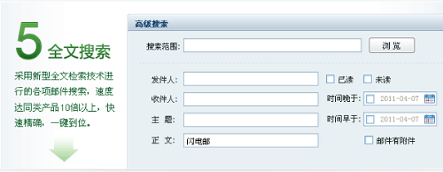 网易闪电邮可以根据主题、发件人、收件人、时间、紧急性等各种条件进行邮件搜索,速度提高10倍。