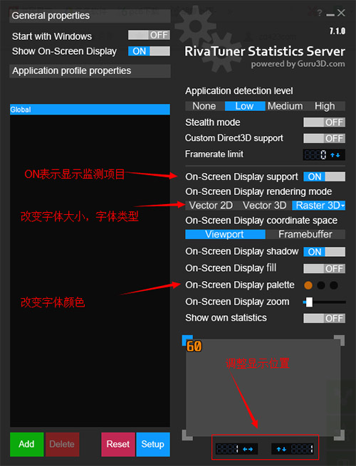 2、进入设定界面后,选择监控,在”已启用的硬件监控图表“点击你想监控的项目,以帧率为例,使帧率项变成高亮的蓝色;拉动页面到最底部,在”在OSD上显示“前的方框打勾;要监测其他项目的话,就重复2和3(有点不人性化),最后点击确定。