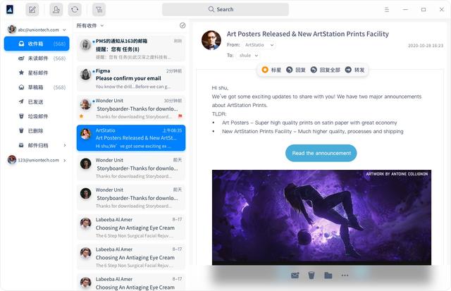 官方表示,邮箱可提供免费和增值的电子邮件服务,支持绑定多个统信账号,支持市面上常用的通信协议如 POP3,IMAP,STMAP 等。