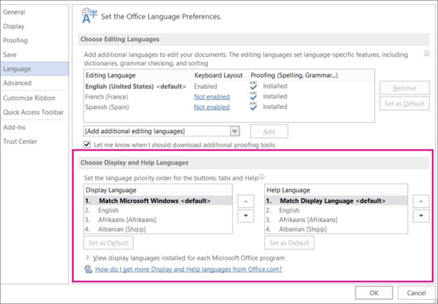 注意:如果你使用的是批量许可版本的Microsoft Office 2016,请联系你的管理员着手安装语言包和/或语言界面包和/或校对工具的批量许可版本。