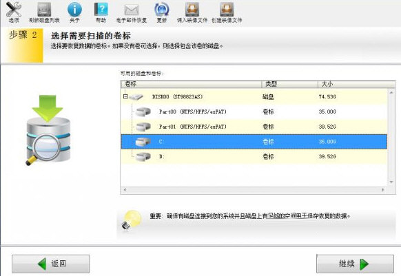 接下来会跳出选择需要扫描的卷标页面,选择文件丢失所在的磁盘即可。如果不确定文件所在位置,可以选择回收站所在的系统盘。