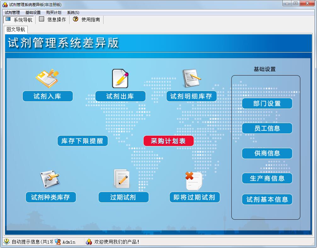 试剂管理系统差异版是针对试剂管理而专门设计的一款管理软件,适用于各类监督检验机构的检测中心,各研究机构的实验室等。 具体功能包括:基础设置(部门设置、员工信息、供商信息、生产商信息和试剂基本信息)、试剂管理(试剂登记、试剂出库、试剂明细库存、试剂种类库存、过期试剂、即将过期试剂和库存下限提醒)、购买计划表等全方位管理。本系统权限设置严格,录入人只能操作自己录入的数据,超级用户可以管理全部数据。